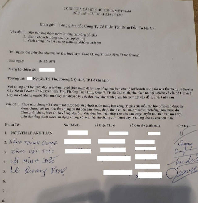 Ngày 17/1/2017, anh Quang đã đại diện cho những khách hàng này gửi đơn khiếu nại tập thể lên chủ đầu tư đòi quyền lợi.