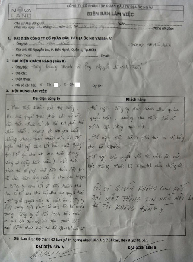 Trong khi đó, Novaland cho biết sẽ giải quyết riêng cho từng khách hàng. Xác minh qua thông tin cá nhân được ghi trong đơn, có một số khách hàng cho biết, chủ đầu tư đã không tính tiền tăng diện tích chênh lệch với những lô officetel của mình.