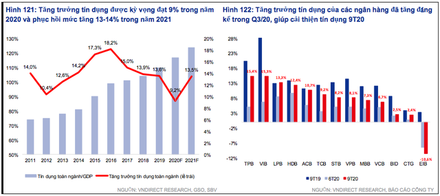 Theo đó, VNDirect dự báo tăng trưởng tín dụng đạt 9% trong năm 2020 và 13 - 14% trong năm 2021. Với kỳ vọng GDP 2020 và năm 2021 tăng lần lượt 2,8% và 7,1%, tỷ lệ tín dụng trên GDP sẽ tăng lên 117% năm 2020 và 124% năm 2021, từ mức 110% năm 2019.