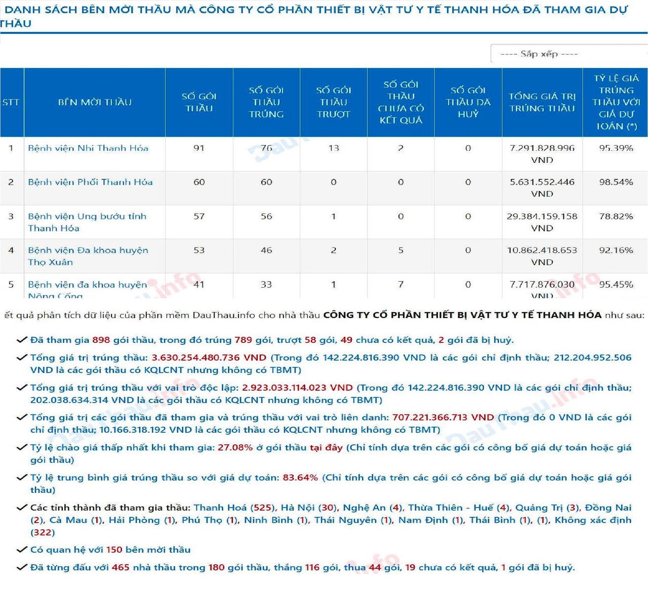 Đặc biệt, tại các gói thầu cung cấp vật tư, hoá chất, thiết bị y tế do do Bệnh viện Nhi Thanh Hoá, Bệnh viện Phổi Thanh Hoá, Bệnh viện Ung Bướu Thanh Hoá... trực tiếp mời thầu mua vật tư, hoá chất, thiết bị cho cho bệnh viện, Vật tư Thiết bị y tế Thanh Hoá là nhà thầu quen thuộc khi một mình tham gia dự thầu và trúng thầu các gói tại các bệnh viện này mà mà ít vấp phải sự cạnh tranh đến từ các nhà thầu khác.