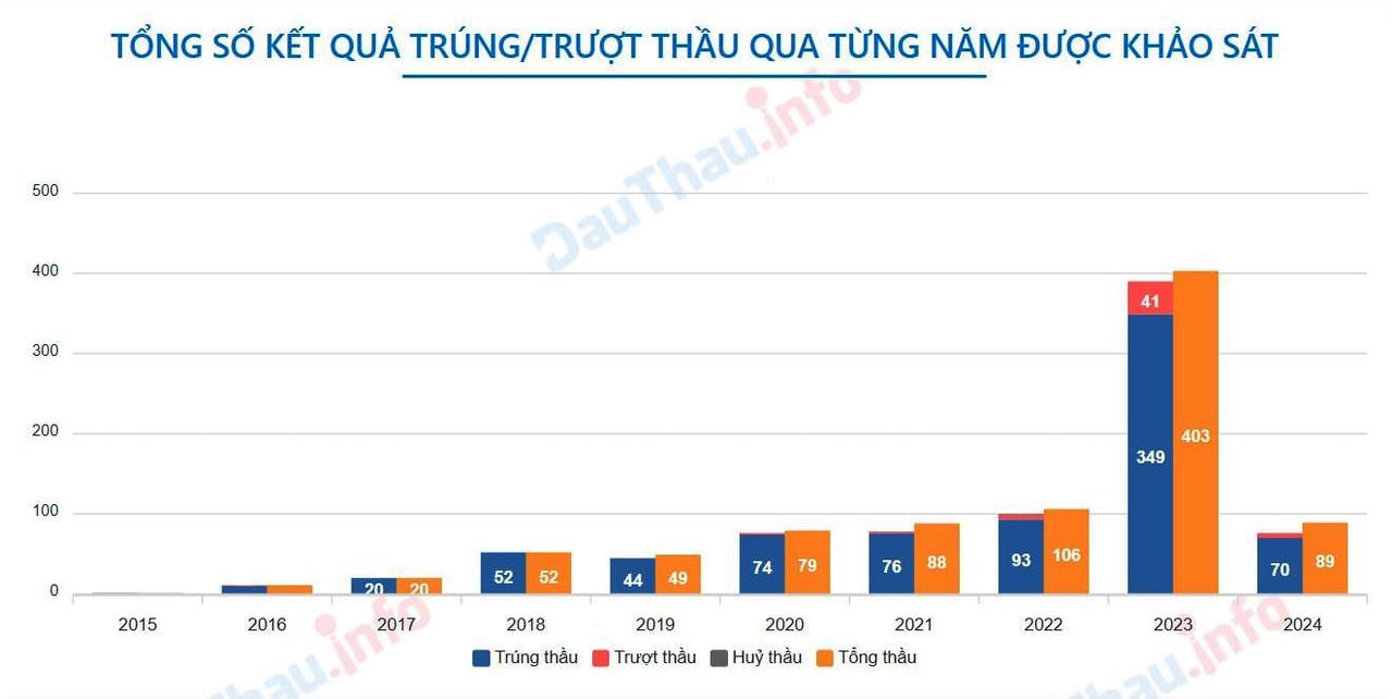 Trong đó, tổng giá trị trúng thầu với vai trò độc lập đạt hơn 2.922,7 tỷ đồng. Tổng giá trị các gói thầu đã tham gia và trúng thầu với vai trò liên danh đạt hơn 707,2 tỷ đồng. Tỷ lệ trung bình giá trúng thầu so với giá dự toán đạt hơn 83.6% (chỉ tính dựa trên các gói có công bố giá dự toán hoặc giá gói thầu)...