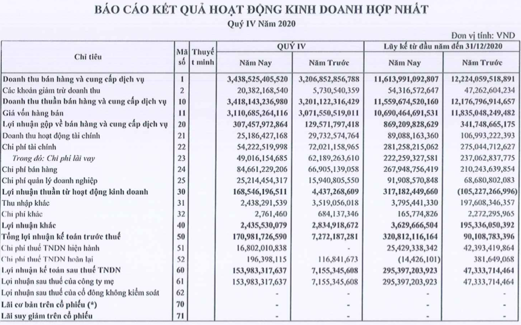 Luỹ kế cả năm 2020, NKG đạt 11.614 tỷ doanh thu, giảm 5%, ngược lại LNST đạt 295 tỷ – cao gấp 6,3 lần so với năm ngoái.