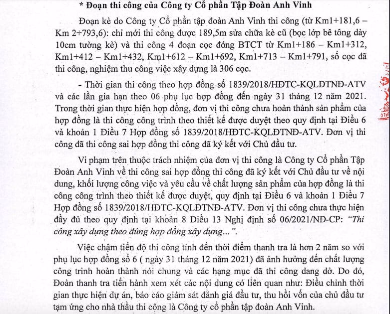 Thanh tra Sở Giao thông Vận tải TP. HCM xác định, CTCP Tập đoàn Anh Vinh cố tình chây ỳ, không thực hiện theo tiến độ hợp đồng đã ký kết tại Gói thầu xây dựng công trình phần trên cạn, thuộc dự án chống sạt lở bán đảo Thanh Đa – đoạn 4.