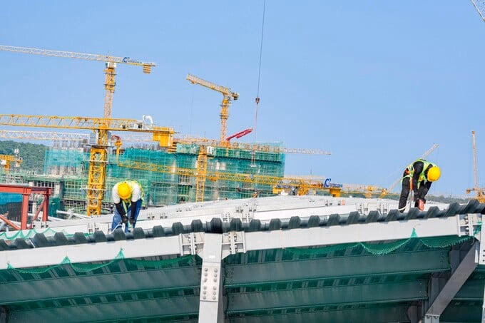 Song song với các mũi thi công kết cấu thép, dự án đang được triển khai theo phương thức “cuốn chiếu”, tối ưu hóa tiến độ trên toàn công trường. Ngay khi các phân đoạn mái được hoàn thiện, công tác lợp mái và xây tường bao cũng được tổ chức triển khai đồng thời, giúp rút ngắn thời gian thi công tổng thể. Cách làm này không chỉ tận dụng hiệu quả từng “khoảng trống” thi công mà còn khẳng định năng lực tổ chức, điều phối và làm chủ tiến độ ở quy mô siêu dự án của Tập đoàn Sun Group.