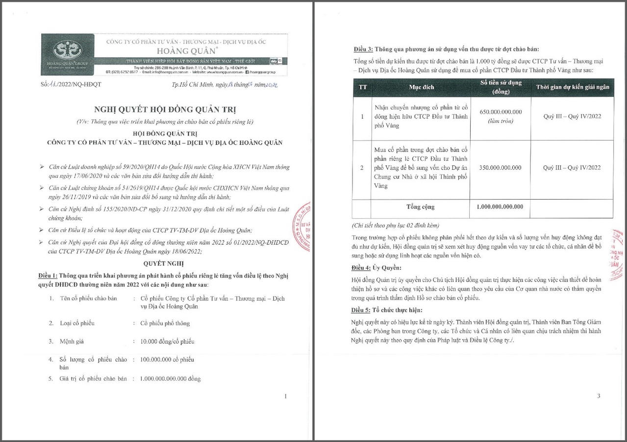 Về mục đích chào bán cổ phiếu, HQC cho biết, sẽ dùng 650 tỷ đồng để nhận chuyển nhượng cổ phần từ cổ đông hiện hữu là CTCP Đầu tư Thành phố Vàng. Phần còn lại 350 tỷ đồng dùng để mua cổ phần trong đợt chào bán cổ phần riêng lẻ của CTCP Đầu tư Thành phố Vàng để bổ sung vốn cho dự án chung cư nhà ở xã hội Thành phố Vàng (Golden City). Thời gian dự kiến giải ngân vào quý III-IV/2022.
