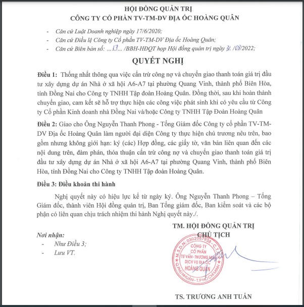 Và mới đây, HQC đã thống nhất sẽ chuyển giao giá trị đầu tư xây dựng dự án nhà ở xã hội A6-A7 tại phường Quang Vinh, thành phố Biên Hoà, Đồng Nai cho Công ty TNHH Tập đoàn Hoàng Quân.