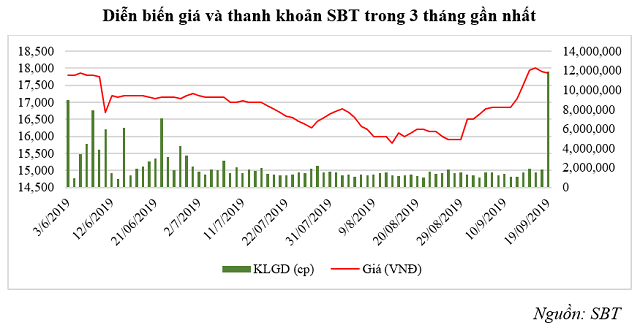 Tính tới thời điểm 20/9, SBT đạt 17.950 đồng/cp, tăng 14% chỉ trong vòng một tháng so với mức giá đáy trong 12 tháng gần nhất là 15.800 đồng/cp tại ngày 14/8. SBT hiện là một trong những mã cổ phiếu có thanh khoản tốt khi khối lượng cổ phiếu giao dịch trung bình 3 tháng gần nhất lên tới gần 2,2 triệu cổ phiếu, tương đương giá trị giao dịch hơn 38 tỷ đồng/phiên. Điều này vượt trội so với các cổ phiếu cùng ngành khi khối lượng giao dịch trung bình chỉ khoảng 150.000 cổ phiếu, giá trị giao dịch khoảng 4,3 tỷ đồng, thấp hơn 15 và 9 lần so với SBT.