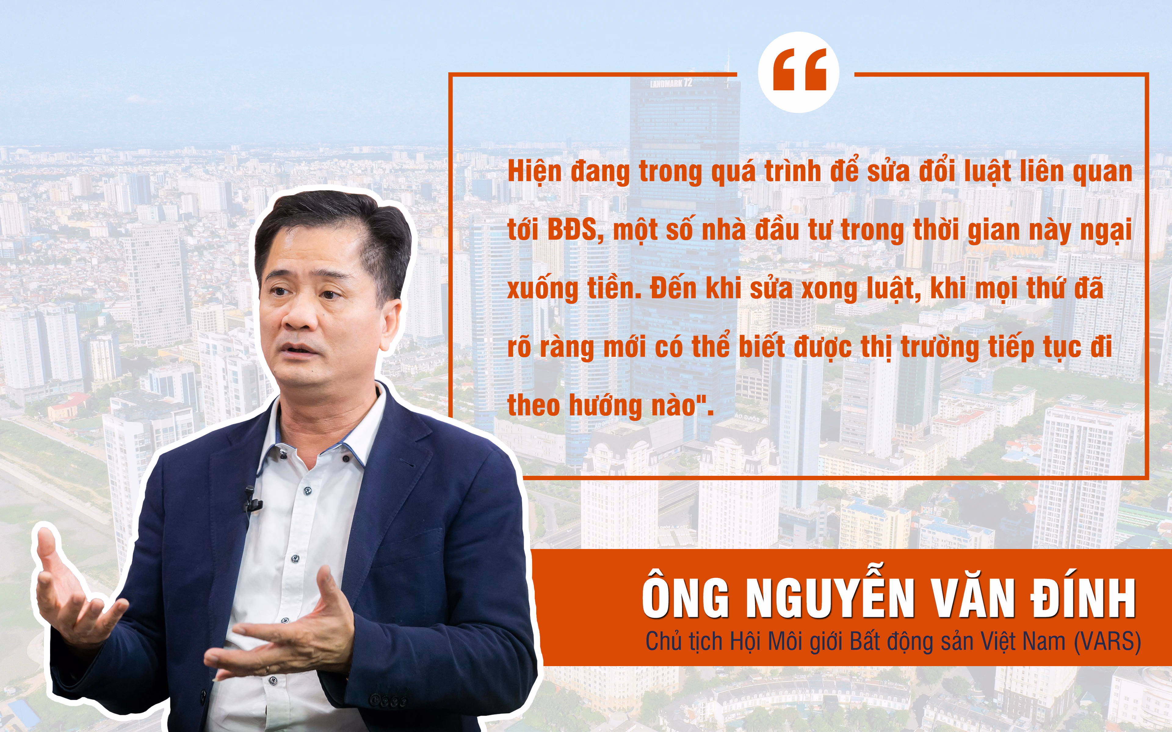 Nhận định về thị trường bất động sản trong năm 2023, ông Đính cho rằng cũng khó có khả năng ổn định, phát triển nếu dòng vốn không được khơi thông. Nhiều ý kiến cho rằng, đầu năm 2023, khi có room tín dụng mới, thị trường bất động sản sẽ đảo chiều, điều này phần nào giúp thị trường trở nên sôi động hơn so với hiện tại. Tuy nhiên, những cơn "sốt đất" như năm 2021, đầu năm 2022 sẽ khó có thể xảy ra.