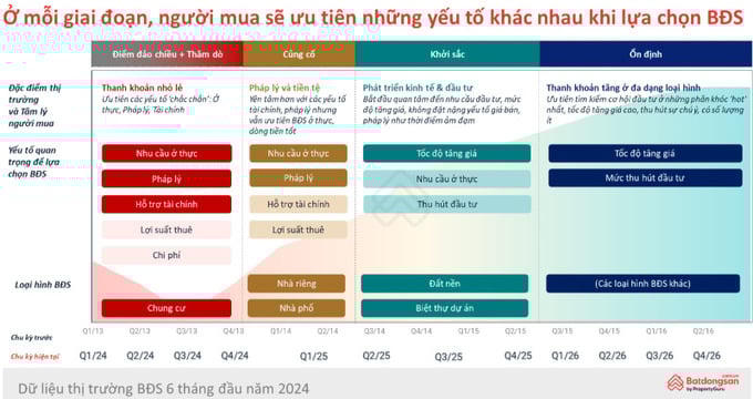 Ông Nguyễn Quốc Anh - Phó tổng giám đốc Batdongsan.com.vn dự báo trong vòng 2 năm tới, thị trường bất động sản Việt Nam có thể đi qua các giai đoạn như đảo chiều, thăm dò, củng cố, khởi sắc và ổn định. Ở mỗi giai đoạn, người mua sẽ ưu tiên những yếu tố khác nhau khi lựa chọn bất động sản.