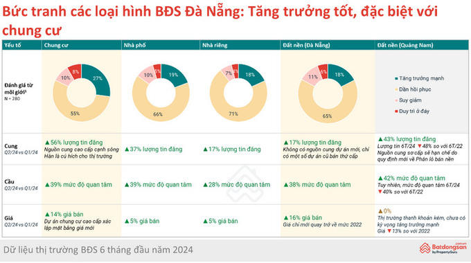 Nhìn chung, tất cả các loại hình bất động sản Đà Nẵng đều chứng kiến các chỉ số tăng lên. Tuy nhiên, chung cư có sự tăng trưởng vượt bậc hơn cả. Cụ thể, lượng tin đăng bán chung cư Đà Nẵng trong quý 2/2024 tăng 56% so với quý 1/2024, mức độ quan tâm và giá rao ban cũng tăng lần lượt là 39% và 14%. Theo khảo sát với các nhà môi giới, 55% cho rằng thị trường chung cư Đà Nẵng dần phục hồi và 27% cho rằng loại hình này đang tăng trưởng mạnh.