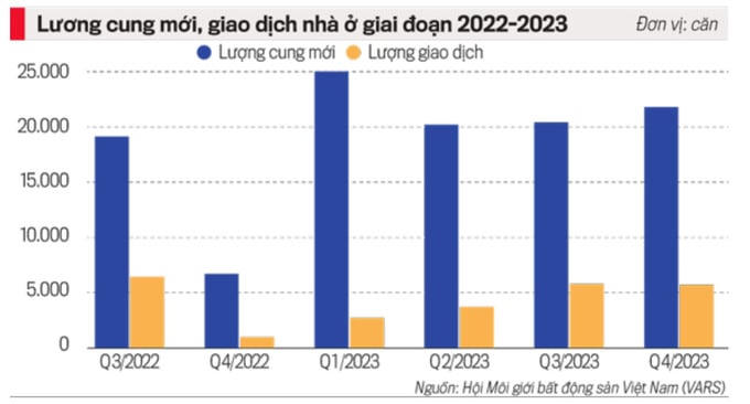 Số liệu của VARS cũng chỉ rõ: trong quý IV/2023, tổng nguồn cung đạt 21.774 sản phẩm, tăng 6% so với quý trước. Số lượng giao dịch tương đương với quý III/2023 và gấp đôi so với các quý đầu năm. Tỷ lệ hấp thụ tiếp tục được cải thiện, đạt 26%, tăng 12 điểm % so với cùng kỳ năm 2022 và tương đương với quý III/2023. Tính chung cả năm 2023, tỷ lệ hấp thụ trên toàn thị trường đạt 33%, với khoảng 18.600 căn hộ, sản phẩm thấp tầng được giao dịch thành công, tương đương với tổng lượng giao dịch nhà ở năm 2022, nhưng vẫn chỉ bằng 17% so với năm 2018. Phân khúc căn hộ trung cấp dẫn đầu về số lượng giao dịch, chiếm 43%, theo sau là phân khúc căn hộ cao cấp, chiếm 27%.