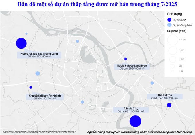 Theo số liệu từ Trung tâm Nghiên cứu thị trường & Am hiểu Khách hàng One Mount Group, trong tháng 7 và 8/2025, thị trường bất động sản Hà Nội ghi nhận 19 dự án nhà ở được công bố hoặc mở bán, cung cấp khoảng 12.000 căn hộ cao tầng và 6.000 căn thấp tầng (biệt thự, liền kề, shophouse).