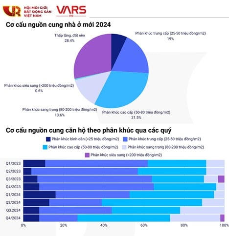 Năm 2024, thị trường bất động sản (BĐS) đã trở lại ấn tượng, trên tất cả phương diện: nguồn cung, giao dịch, giá cả. Theo thống kê của Hội môi giới bất động sản Việt Nam (VARS), năm 2024, toàn thị trường ghi nhận 81.000 sản phẩm chào bán, tăng 40%; riêng số sản phẩm chào bán mới là hơn 65.000, tăng gấp 3 lần so với năm trước. Thanh khoản bùng nổ với hơn 47.000 giao dịch thành công, tăng gấp 3 lần năm 2023, tỷ lệ hấp thụ lên tới 72%.