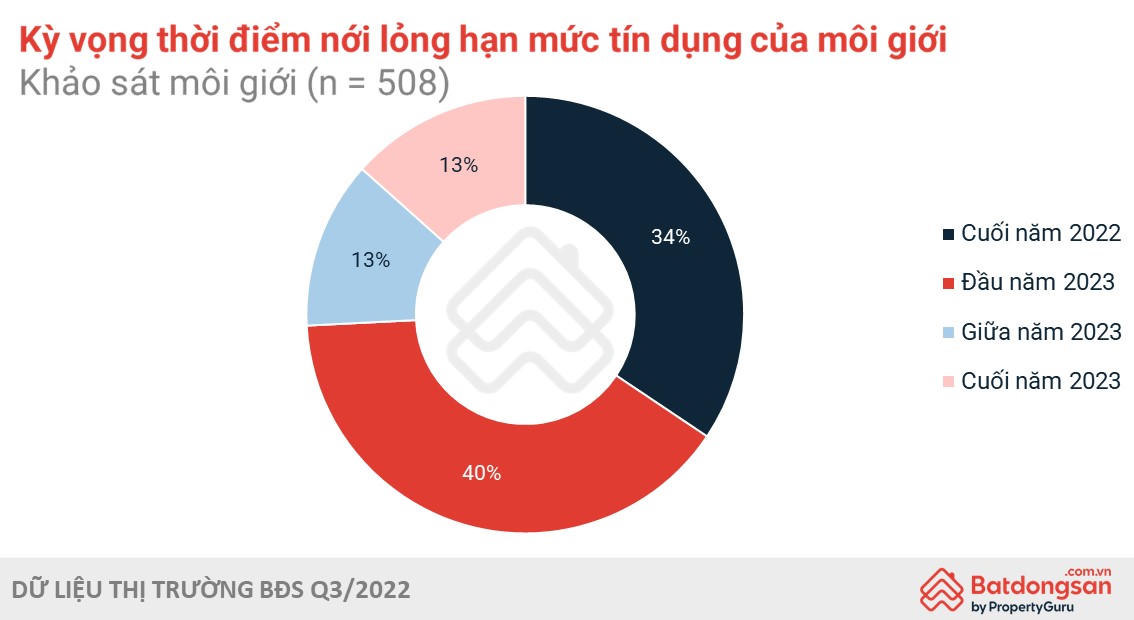 Khảo sát gần đây của Batdongsan.com.vn với hơn 500 thành viên thị trường bất động sản tiết lộ hơn 34% đáp viên cho rằng hạn mức tín dụng sẽ được nới lỏng vào cuối năm 2022, 40% tin điều này sẽ diễn ra vào đầu năm 2023.