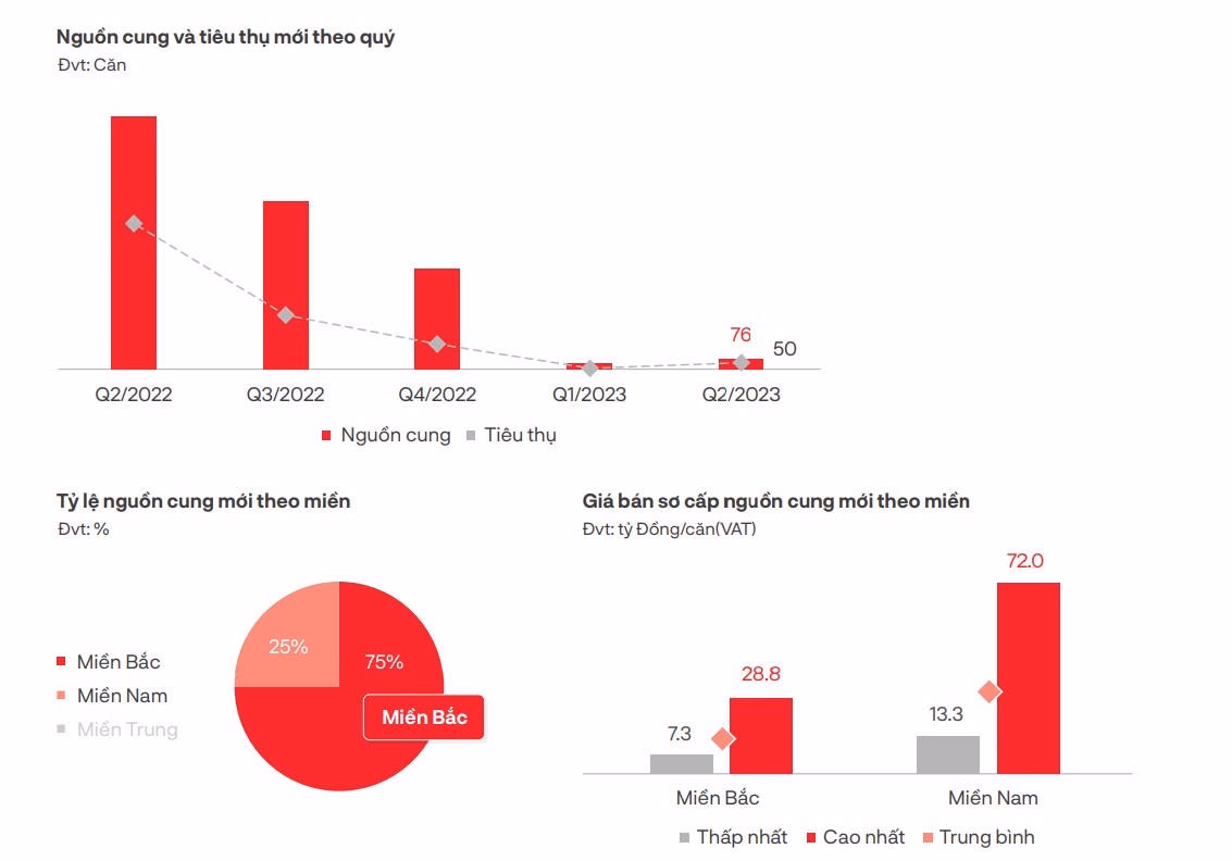 Giá bán sơ cấp không có nhiều biến động so với cùng kỳ. Những chính sách cam kết thuê lại, mua lại, hỗ trợ lãi suất,… được áp dụng rộng rãi nhưng không đạt hiệu quả như kỳ vọng. Trước áp lực về dòng tiền, nhiều chủ đầu tư đưa ra mức chiết khấu lên đến 40% - 50% khi thanh toán nhanh nhằm nhanh chóng thu hồi vốn cũng như giúp tăng thanh khoản giữa tình hình thị trường bất động sản khó khăn như hiện nay.