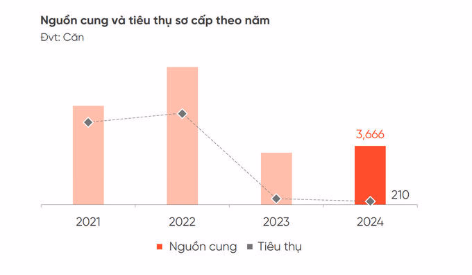 Sức cầu thậm chí “tệ” hơn ở loại hình nhà phố, shophouse nghỉ dưỡng. Với 3.666 căn ra thị trường trong năm 2024 nhưng chỉ có 210 căn được hấp thụ, chiếm tỉ lệ 6%. Theo DKRA Consulting, nguồn cung nhà phố, shophouse nghỉ dưỡng sơ cấp tăng 12% so với cùng kỳ, tuy nhiên vẫn còn ở mức khá thấp so với giai đoạn trước năm 2022.