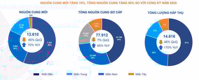 Nguồn cung mới ước đạt 13,610 sản phẩm tăng 70% theo năm nhưng giảm 65% theo quý; nâng tổng nguồn cung sơ cấp đạt 77,912 sản phẩm, tăng 65% so với cùng kỳ năm 2025 nhưng giảm 7% so với quý 4/2025.