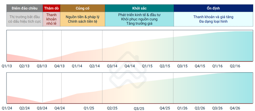 "Điểm đảo chiều của thị trường bất động sản có thể xuất hiện từ quý 2-4/2024. Thị trường sau đó sẽ bước vào chu kỳ mới và trải qua 4 giai đoạn: Thăm dò, củng cố, khởi sắc và ổn định", ông Quốc Anh dự báo.