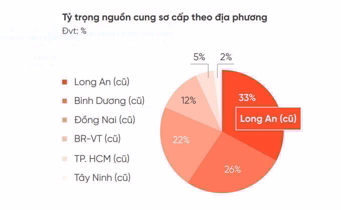 Cụ thể, ở phân khúc đất nền trong quý II ghi nhận nguồn cung sơ cấp giảm nhẹ 8% so với cùng kỳ năm 2024. Nguồn cung chủ yếu đến từ các dự án đã mở bán trước đó, chiếm đến 95%. Ba thị trường trọng điểm gồm Long An (cũ), Bình Dương (cũ) và Đồng Nai (cũ) tiếp tục dẫn dắt nguồn cung sơ cấp, với tỷ trọng khoảng 81%, tương đương 5,225 sản phẩm đang mở bán. Sức cầu chung của thị trường đạt mức tăng tích cực 2.4 lần so với quý II/2024, lượng giao dịch tập trung chủ yếu ở Long An (cũ) và Bình Dương (cũ), chiếm hơn 92.2% tổng lượng tiêu thụ sơ cấp. Mặt bằng giá sơ cấp giữa các tỉnh/thành (cũ) ghi nhận biên độ chênh lệch lớn ở các khu vực, trong khi giá thứ cấp tăng trung bình khoảng 4% so với quý trước.