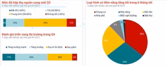 Về triển vọng thị trường trong quý IV, có 60% môi giới tin rằng thị trường sẽ tiếp tục tăng trưởng, trong đó 17% kỳ vọng tăng mạnh. Khoảng 1/3 cho rằng thị trường sẽ duy trì ổn định, và chỉ 6% lo ngại khả năng suy giảm.