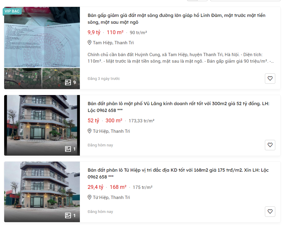 Trên một số website, mạng xã hội rao bán nhà đất thuộc huyện Thanh Trì với mức giá cao, ngang ngửa với các quận nội thành Hà Nội. Đơn cử như, một mảnh đất mặt sông, giáp hồ Linh Đàm thuộc Tứ Hiệp, Thanh Trì rộng 110m2 được rao bán với giá 9,9 tỷ đồng tương ứng với 90 triệu/m2.