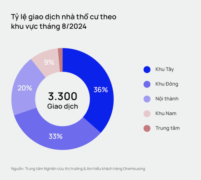 Cụ thể, trong tháng Ngâu (tháng 7 m lịch) năm 2024, thị trường bất động sản thổ cư ghi nhận khoảng 3.300 giao dịch. Con số này chỉ giảm nhẹ so với các tháng trước đó, cho thấy giao dịch vẫn diễn ra rất sôi động mặc dù tháng Ngâu thường là thời điểm giao dịch kém theo quan niệm chung của người Việt.Xét về khu vực, khu Tây (Cầu Giấy, Nam Từ Liêm, Bắc Từ Liêm, Hà Đông) dẫn đầu thị trường với khoảng 1.200 giao dịch, chiếm 36% thị phần, tiếp theo là khu Đông (Gia Lâm, Long Biên) với khoảng 1.100 giao dịch, chiếm 33% thị phần.