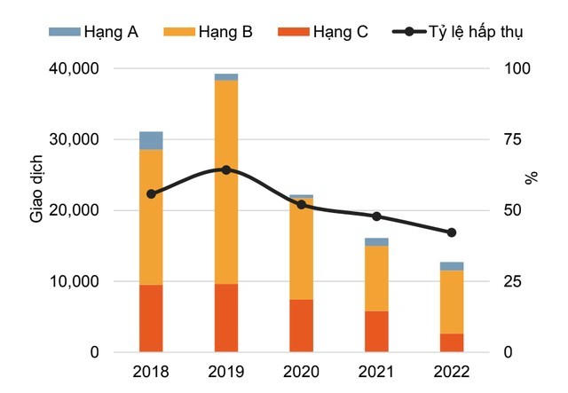 Về tỷ lệ tiêu thụ, toàn thị trường năm 2022 chỉ đạt khoảng 39%, tương đương 19.000 giao dịch thành công, bằng 69% lượng tiêu thụ năm 2021 và chỉ bằng 17% lượng giao dịch của năm 2018. Riêng quý IV/2022, tỷ lệ hấp thụ chỉ đạt mức 14%.