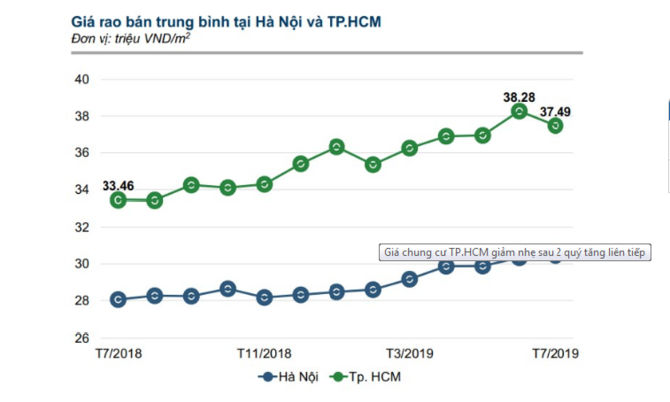 Trái ngước với diễn biến trên, giá rao bán trung bình phân khúc căn hộ chung cư tại TP.HCM trong tháng 7 có dấu hiệu giảm nhẹ so với tháng 6. Tuy nhiên, nếu so với cùng kỳ 2018, mặt bằng giá bán căn hộ vẫn trong xu hướng tăng.