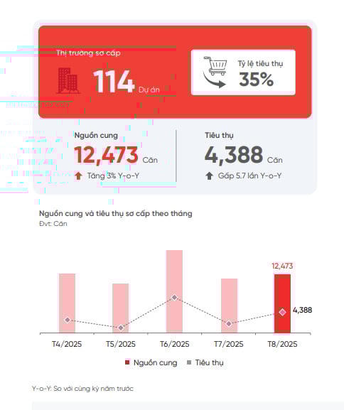 Phân khúc căn hộ ghi nhận lượng tiêu thụ trong tháng đạt gần 4.400 căn, gấp 5,7 lần so với cùng kỳ năm trước. Tỷ lệ tiêu thụ trên nguồn cung sơ cấp đạt 35%, cho thấy niềm tin của người mua nhà đang dần quay trở lại.