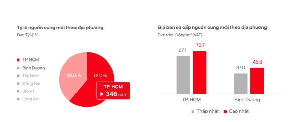 Cụ thể, giá căn hộ sơ cấp ở TP Hồ Chí Minh đang dao động 67,1 - 76,7 triệu đồng/m2. Còn tại Bình Dương, mức giá khoảng 37 - 46,8 triệu đồng/m2.