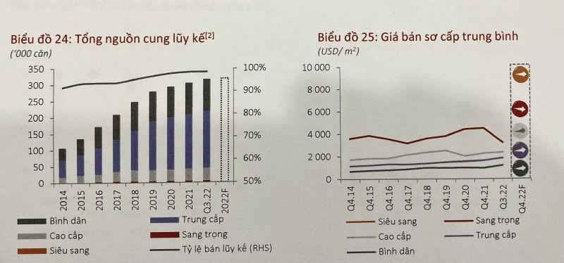 Ngoài ra, lượng tồn kho căn hộ sơ cấp chiếm 66% nguồn cung, lớn nhất kể từ năm 2019. Đáng chú ý, có tới 89% lượng hàng tồn kho này thuộc về các căn hộ hạng A và hạng B.