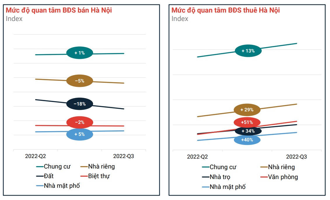 Theo báo cáo thị trường bất động sản quý 3/2022 của Batdongsan.com.vn, chung cư và nhà phố là hai phân khúc ghi nhận mức độ tăng trưởng dương trong bối cảnh mức độ quan tâm chung với bất động sản bán tại Hà Nội giảm nhẹ. Cụ thể, các phân khúc từ biệt thự đến nhà riêng, đất nền đều ghi nhận mức độ quan tâm giảm mạnh trong quý 3 vừa qua. Phân khúc đất nền chịu mức độ giảm mạnh nhất đến 18%. Trong khi đó, mức độ quan tâm đến chung cư và nhà phố tăng trưởng lần lượt 1% và 5%.