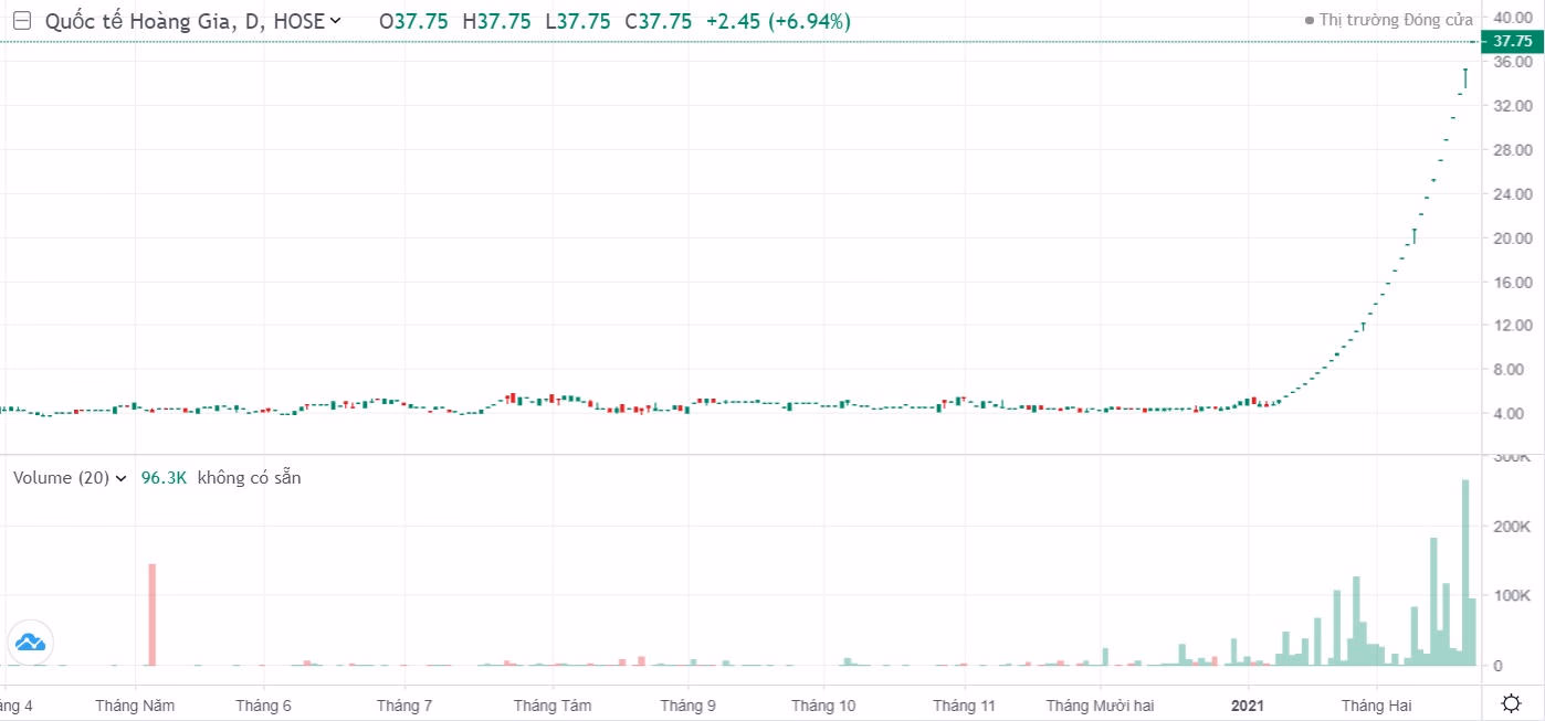 Đáng chú ý trên sàn là cổ phiếu RIC của Công ty cổ phần Quốc tế Hoàng Gia, tăng trần 31 phiên liên tục khiến nhiều nhà đầu tư chỉ biết buông lên câu “Tiếc thật!” dù trước đó đây không phải là một cổ phiếu tiềm năng. RIC mở cửa phiên giao dịch đầu năm 2020 ở vùng giá 5.000 đồng/cổ phiếu và suốt một năm ròng không nhúc nhích gì đáng kể. Nhà đầu tư cũng chẳng ai quan tâm cổ phiếu RIC khi mà suốt nhiều năm qua thanh khoản cổ phiếu RIC luôn ở mức thấp. Thông tin chính thức của RIC cũng không có nhiều và chẳng có gì đột biến. Nhớ đến RIC, người ta chủ yếu nhớ đến lĩnh vực kinh doanh "là lạ" casino nhưng trước đến nay chủ yếu phục vụ khách nước ngoài.