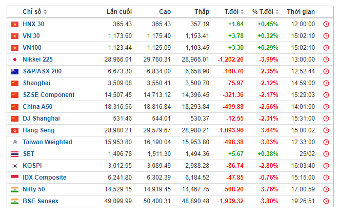 Việc lãi suất trái phiếu kho bạc Mỹ tăng mạnh thời gian gần đây đã tác động tiêu cực tới thị trường chứng khoán Châu Á, khiến nhiều chỉ số giảm sâu trong phiên giao dịch cuối tháng 2. Chỉ số Nikkei 225 (Nhật Bản) giảm 3,99%, Kospi (Hàn Quốc) giảm 2,8%, Shanghai Composite (Thượng Hải) giảm 2,12%, Hangseng Index (HongKong) giảm 3,64%,…