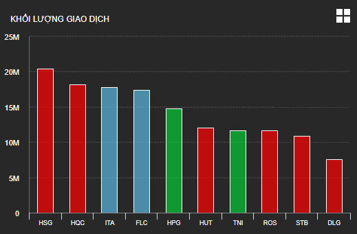 Vẫn có 4 cổ phiếu bất động sản nằm trong danh sách 10 mã khớp lệnh mạnh nhất toàn thị trường gồm HQC, ITA, FLC và DLG, trong đó HQC khớp lệnh được 18,2 triệu cổ phiếu, ITA khớp lệnh 17,8 triệu cổ phiếu, FLC và DLG khớp lệnh lần lượt 17,5 triệu cổ phiếu và 7,6 triệu cổ phiếu.