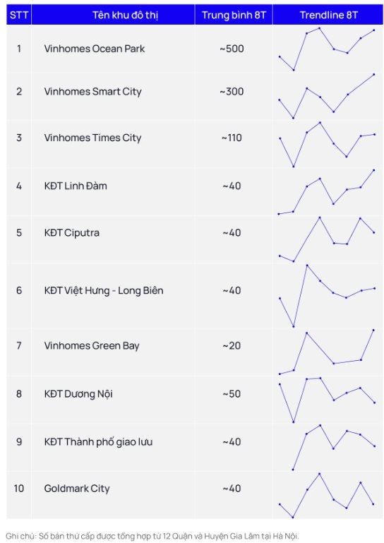 OneHousing cũng đã thống kê top 10 dự án tại Hà Nội có số lượng giao dịch chuyển nhượng cao nhất, với tổng cộng khoảng 1.500 căn được chuyển nhượng, chiếm 48% thị phần chuyển nhượng toàn thành phố trong tháng 8. Đáng chú ý, 8 trong số 10 dự án này nằm ở khu Đông và khu Tây Hà Nội.