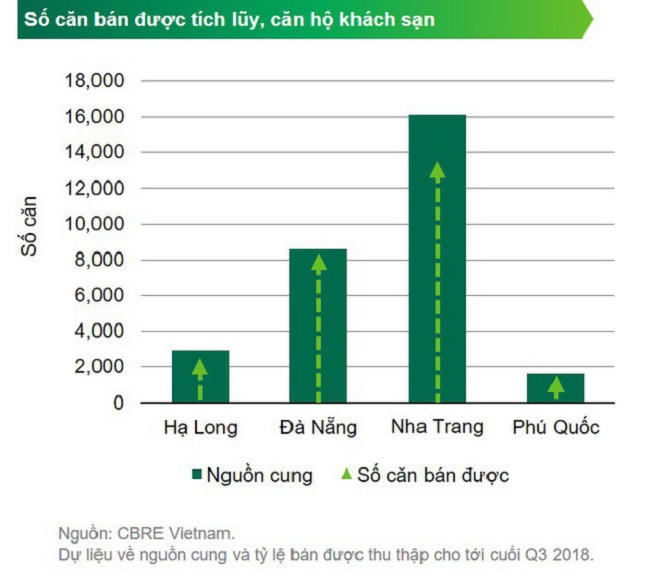 Ở Nha Trang, Quý III/2018 mặc dù nguồn cung đã chững lại nhưng thị trường vẫn tiếp tục ghi nhận lượng căn hộ chào bán mới khoảng trên 1.000 căn, nâng tổng số nguồn hàng Condotel Nha Trang lên 12.000 căn.