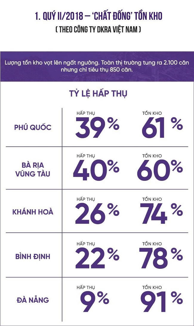Cũng trong một báo cáo của DKRA Việt Nam năm 2018, thị trường căn hộ nghỉ dưỡng condotel từ Đà Nẵng đến Phú Quốc trong các tháng 4, 5, 6/2018 với lượng tồn kho vọt cao ngất ngưởng lên đến 90%. Toàn thị trường tung ra 2.100 căn nhưng chỉ tiêu thụ 850 căn. Theo đó, lượng hàng tồn kho condotel tại Khánh Hòa, Bình Định, Đà Nẵng lần lượt là 74-78-91%.