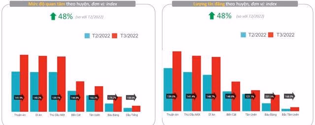 Tại 3 thành phố Dĩ An, Thuận An và Thủ Dầu Một tiếp tục là các thị trường có lượng sản phẩm BĐS rao bán nhiều nhất, trong đó TP. Thuận An dẫn đầu về lượng tin đăng bán và nhu cầu tìm kiếm BĐS của toàn tỉnh. Dĩ An và Thủ Dầu Một cũng có lượng tin đăng bán nhà đất tăng 41% và 48%. Trong tháng vừa qua, các huyện vùng ven Bình Dương như Bàu Bàng và Tân Uyên ghi nhận bứt phá mạnh về nguồn cung nhà đất chào bán với mức tăng trưởng tin rao BĐS tăng 68-100%.