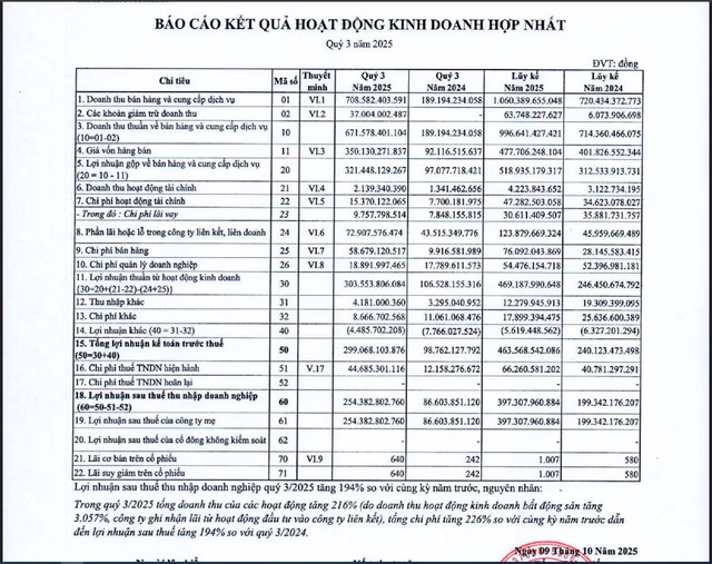 Công ty CP Phát triển Nhà Bà Rịa – Vũng Tàu cũng công bố kếtquả sơ bộ quý III/2025 đầy ấn tượng với lợi nhuận trước thuế ước đạt 666 tỉ đồng,cao gấp 35 lần cùng kỳ năm ngoái.