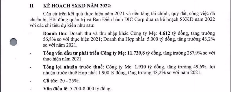 Theo đó, về kế hoạch kinh doanh DIC Corp đặt mục tiêu tổng doanh thu đạt 5.000 tỷ đồng, lợi nhuận trước thuế 1.900 tỷ đồng, lần lượt tăng 43,2% và 48,2% so với thực hiện trong năm 2021.