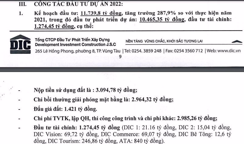 Dự án Chung cư A5, A4 – Chí Linh với kế hoạch đầu tư năm 2022 là 55,66 tỷ đồng; dự án Khu Đô thị mới Bắc Vũng Tàu với kế hoạch đầu tư là 1.724,49 tỷ đồng. Ngoài ra còn có dự án Cap Saint Jacques (CSJ) với kế hoạch 509,09 tỷ đồng; dự án Khối văn phòng DIC Corp 37,47 tỷ đồng và dự án khu dân cư đợt đầu 35 ha Đô thị mới Phú Mỹ ATA.
