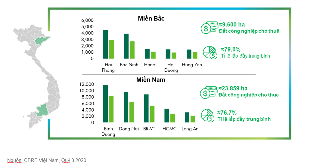 Tính tới quý III/2020, tổng diện tích đất của các khu công nghiệp tại 5 tỉnh, thành phố công nghiệp chính miền Bắc (bao gồm Hà Nội, Bắc Ninh, Hưng Yên, Hải Dương và Hải Phòng) đã đạt 13.800ha, với 9.600ha đất công nghiệp cho thuê. Tỷ lệ lấp đầy trung bình của khu công nghiệp duy trì ở mức tích cực 79%.