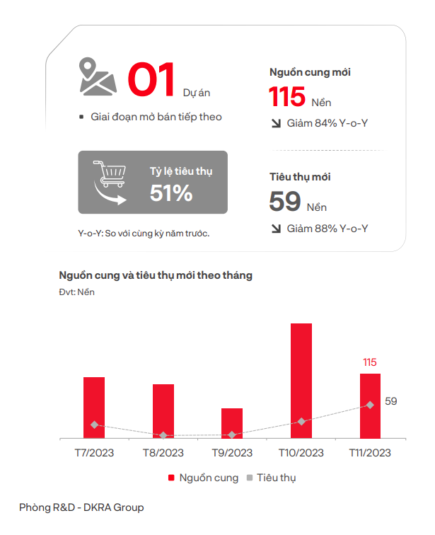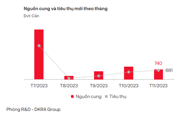 Theo đó có 681 căn hộ được tiêu thụ trong tháng 11/2023, cao gấp 3,1 lần so với cùng kỳ năm trước.