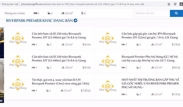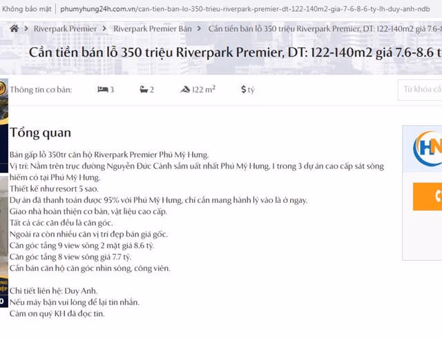 Một dự án khác cũng xuất hiện tình trạng rao bán “cắt lỗ” hàng trăm triệu đồng là Riverpark Premier. Cụ thể, chủ sở hữu căn hộ rao “bán gấp lỗ 350tr căn hộ cao cấp Riverpark Premier Phú Mỹ Hưng” có diện tích 122-140m2 giá 7.6-8.6 tỷ.