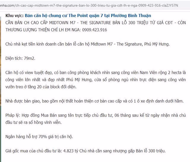 Theo đó, một mẩu tin “chủ nhà kẹt tiền kinh doanh cần bán cắt lỗ căn hộ Midtown M7 - The Signature, Phú Mỹ Hưng” đã chào bán căn hộ có diện tích 79m2. Giá gốc mua của chủ đầu tư là: 4.823 tỷ, chủ nhà cần sang nhượng gấp bán lỗ 300 triệu đồng.