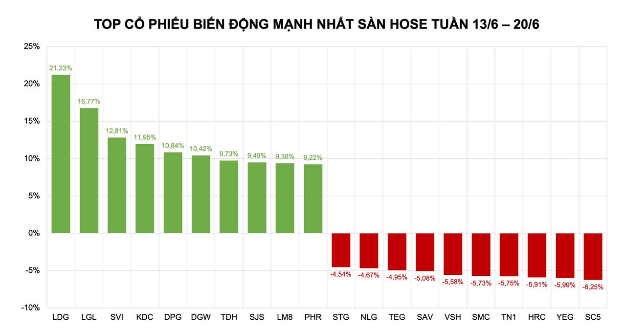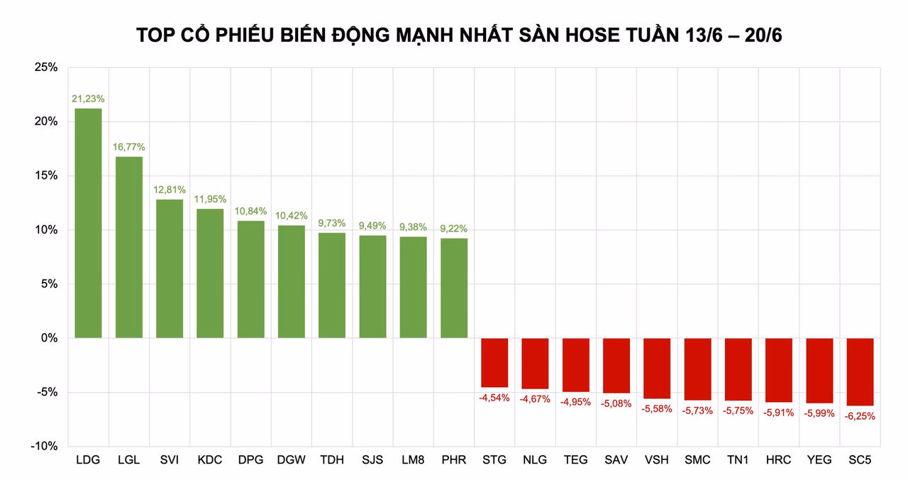 Trên sàn HoSE, 10 cổ phiếu tăng mạnh nhất tuần vừa qua lần lượt là LDG (+21,23%), LGL (+16,77%), SVI (+12,81%), KDC (+11,95%), DPG (+10,84%), DGW (+10,42%), TDH (+9,73%), SJS (+9,49%), LM8 (+9,38%) và PHR (+9,22%).