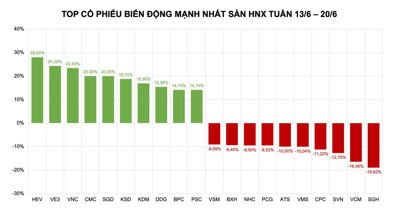 Tương tự HoSE, dòng tiền trên sàn HNX cũng hướng mạnh vào nhóm penny. Top 10 cổ phiếu tăng mạnh nhất tuần gồm HEV (+28,03%), VE3 (+24,29%), VNC (+23,40%), CMC (+20%), SGD (+20%), KSD (+18,75%), KDM (+16,89%), DDG (+15,38%), BPC (+14,15%) và PSC (+14,14%).