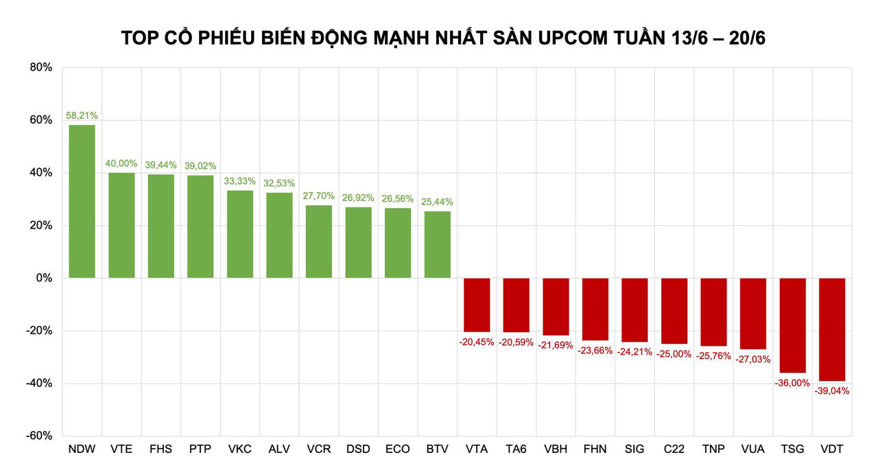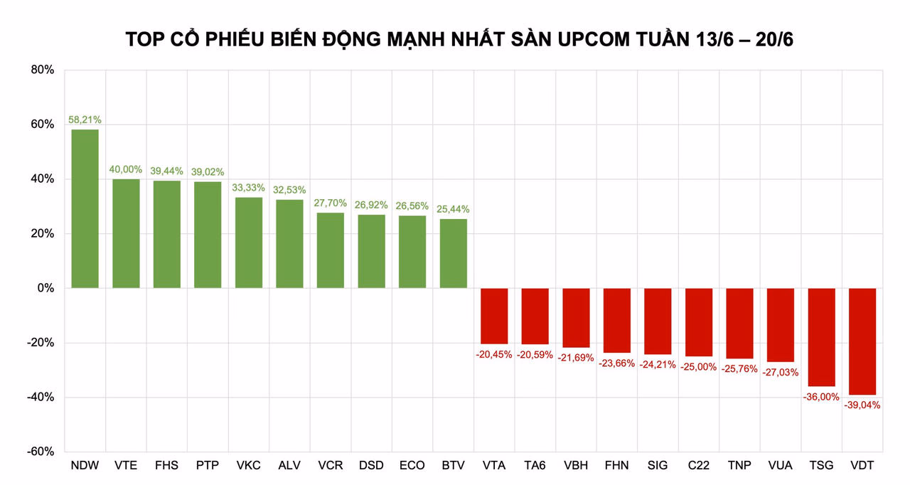 Trên sàn UPCoM, top 10 cổ phiếu tăng mạnh gồm NDW (+58,21%), VTE (+40%), FHS (+39,44%), PTP (+39,02%), VKC (+33,33%), ALV (+32,53%), VCR (+27,70%), DSD (+26,92%), ECO (+26,04%) và BTV (+25,44%).