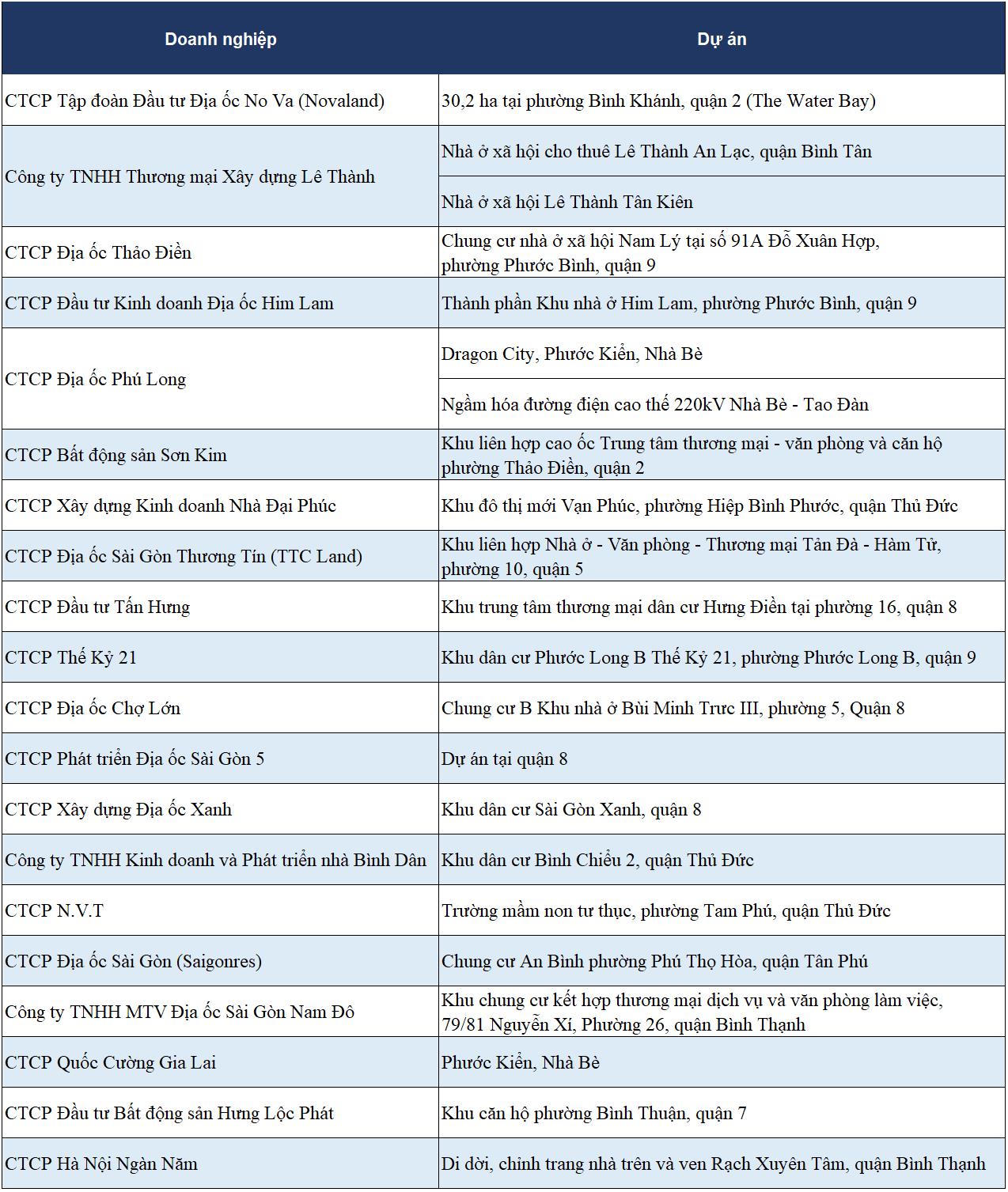 Bên cạnh đó, còn có khá nhiều doanh nghiệp BĐS như Đại Phúc, Him Lam, Công ty Xây dựng địa ốc Xanh, Vietcomreal, Hưng Lộc Phát... cũng có nhiều dự án bị dừng triển khai do vướng mắc pháp lý.